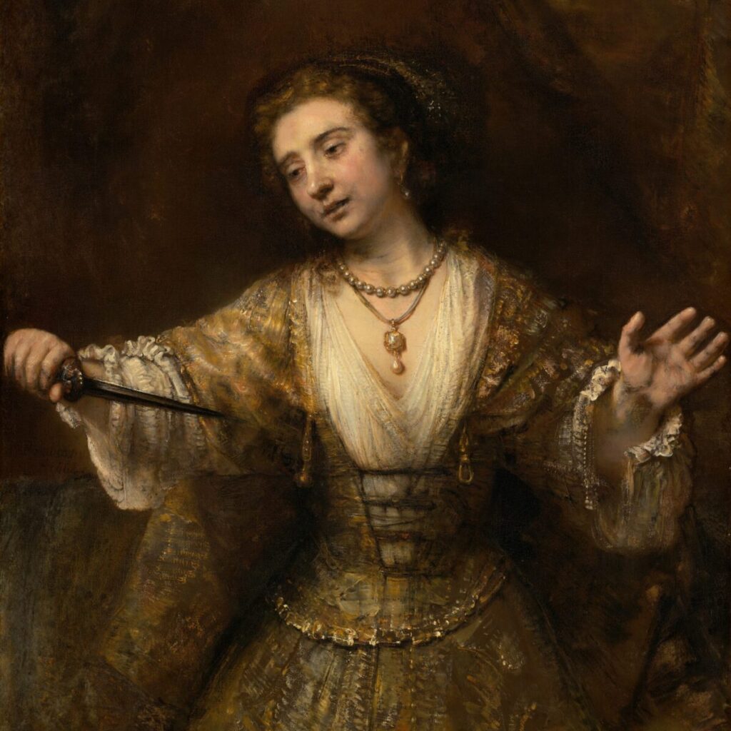 Lucretia lebte ungefähr 500 Jahre vor unserer Zeitrechnung in der Nähe von Rom und galt als tugendhafte Frau – und sie gefiel dem Königssohn Sextus Tarquinius, der sie nachts in ihrem Schlafzimmer aufsuchte und mit einem Dolch bedrohte. Sie aber wollte lieber sterben als ihrem Ehemann untreu werden. Daraufhin sagte Sextus Tarquinius, er werde sie, nachdem er sie vergewaltigt habe, töten, danach den nackten Leib eines toten Sklaven neben sie legen, und dann behaupten, er, Sextus Tarquinius, hätte sie beim Ehebruch erwischt. In dieser Not gab sich Lucretia ihm hin. Nachdem Sextus Tarquinius abgereist war, schickte sie nach ihrem Vater und ihrem Ehemann. Als diese sie zutiefst betrübt vorfanden und fragten, ob denn „nicht alles gut stehe“, sagte sie: „Ganz und gar nicht! Wie kann es gut um ein Weib stehen, die (sic) ihre Ehre verloren hat? … Doch nur der Körper ist entweiht; die Seele ist rein; das soll mein Tod bezeugen … Keine nach mir soll, auf Lucretien sich berufend, bei Unkeuschheit das Leben behalten wollen.“1 Dann nahm sie einen Dolch unter ihrem Kleid hervor und stach sich ins Herz.